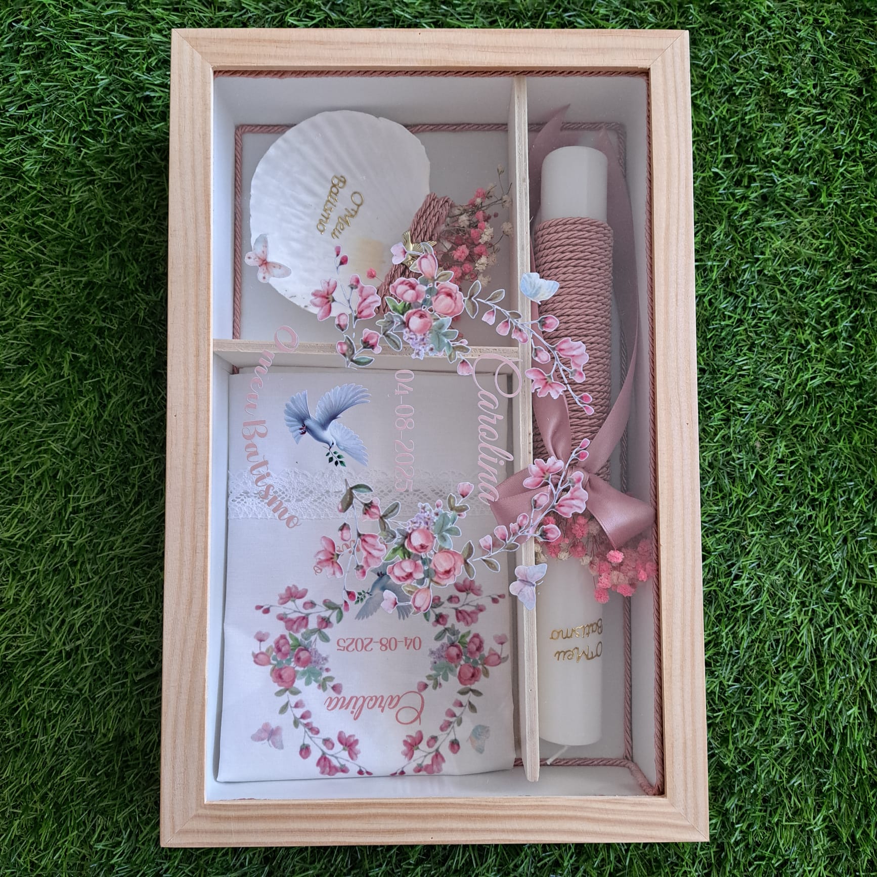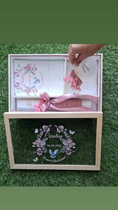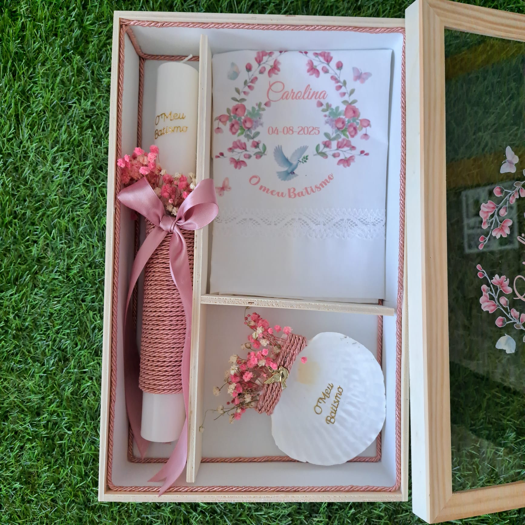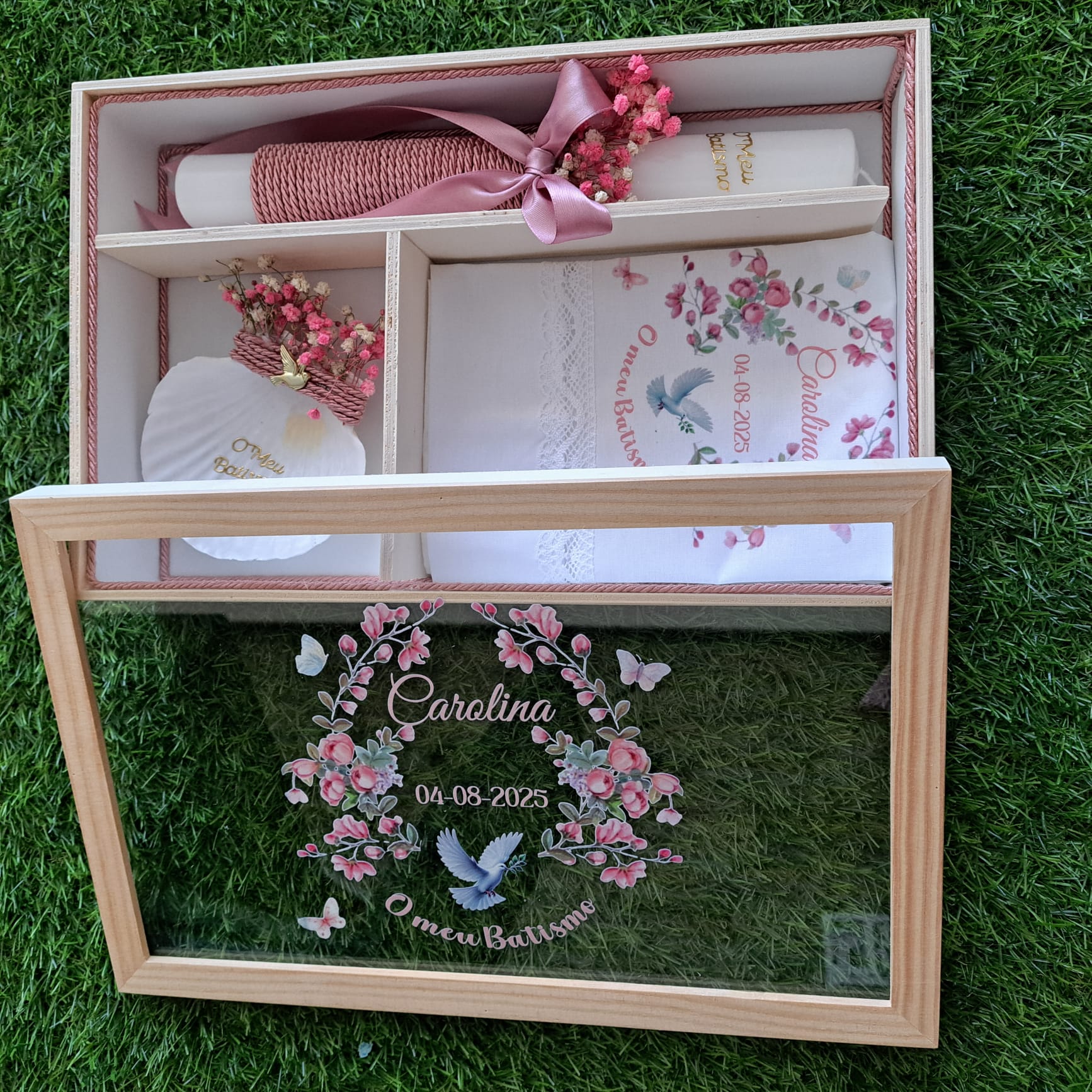 Caixa de Batismo com tampa em vidro, composta por 3 espaços diferenciados, para vela, concha e toalha.