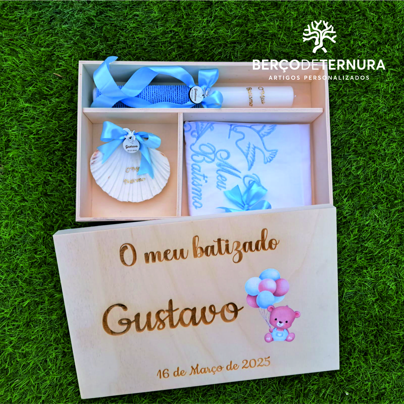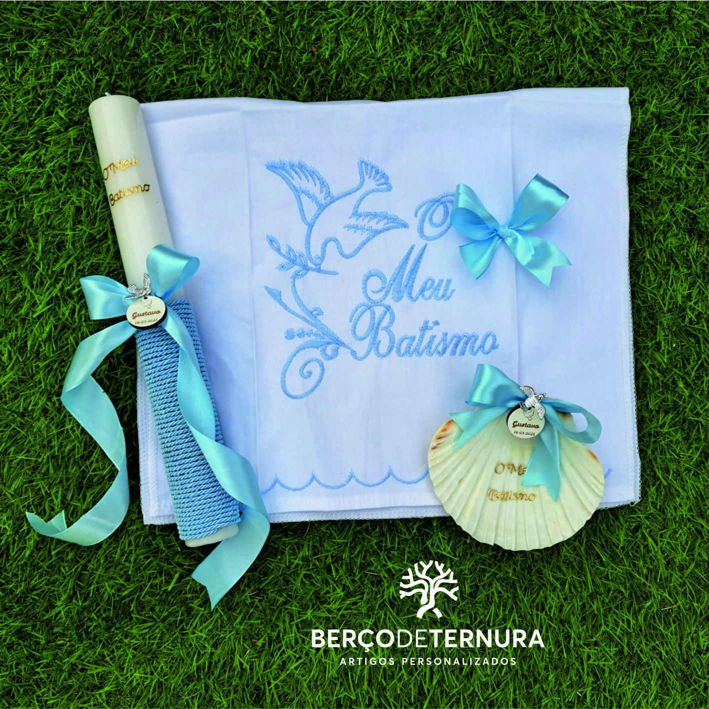 Caixa de Batismo Composta por 3 espaços diferenciados, para vela, concha e toalha. A vela – acesa a partir do círio pascal – representa a luz que protege e ilumina os caminhos de quem está recendo o sacramento. Ela afasta as energias negativas e inspira a elevação espiritual. A Concha – que sacerdote usa para derramar um pouco de água na cabeça do batizando pois a água é, sem dúvida, o principal símbolo do sacramento do batismo. A Toalha – para secar a cabeça do bebé após receber a água de batismo de cor branca. Cor da graça e da manifestação divina, que representa a pureza. Possibilidade de adquirir apenas a caixa sem a vela, concha e toalha. *As cores e modelos dos apontamentos na vela, concha e toalha podem variar.