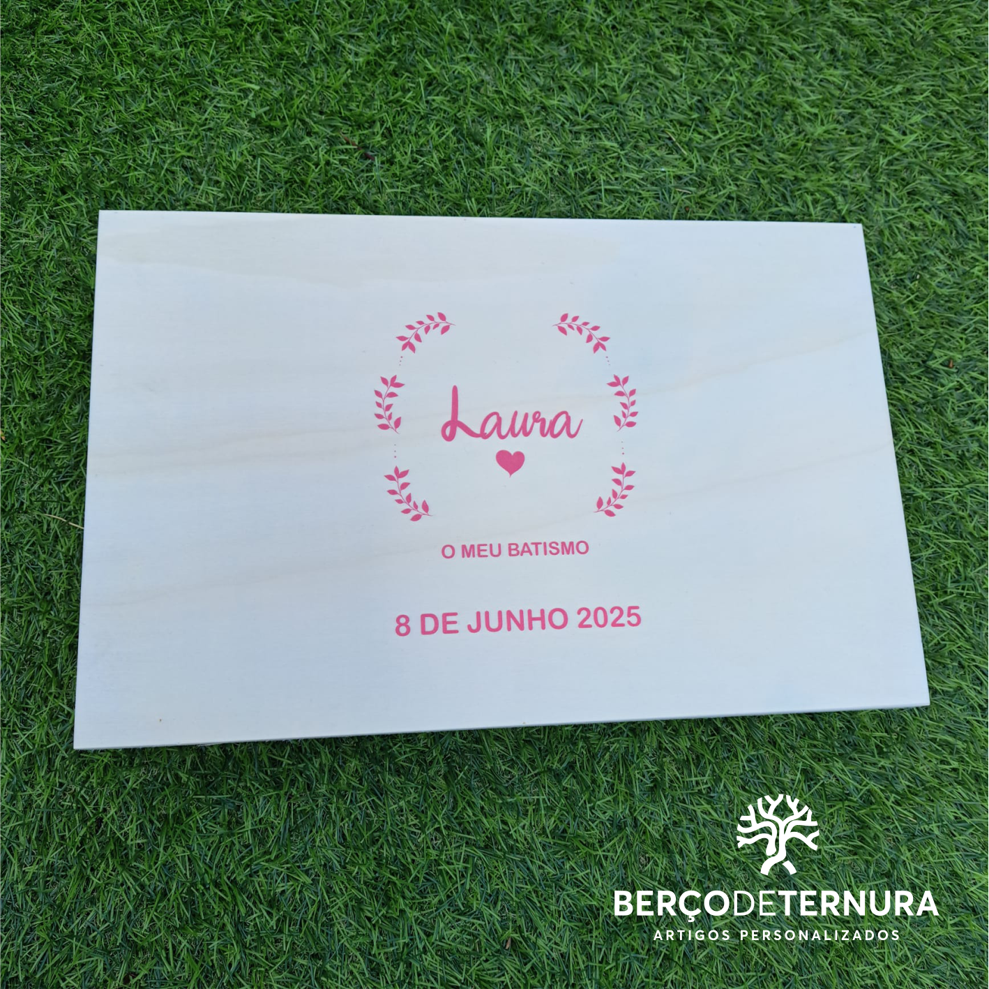 Caixa de Batismo Composta por 3 espaços diferenciados, para vela, concha e toalha. A vela – acesa a partir do círio pascal – representa a luz que protege e ilumina os caminhos de quem está recendo o sacramento. Ela afasta as energias negativas e inspira a elevação espiritual. A Concha – que sacerdote usa para derramar um pouco de água na cabeça do batizando pois a água é, sem dúvida, o principal símbolo do sacramento do batismo. A Toalha – para secar a cabeça do bebé após receber a água de batismo de cor branca. Cor da graça e da manifestação divina, que representa a pureza.
