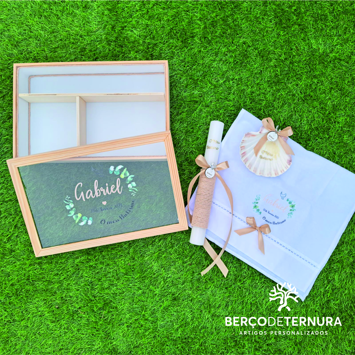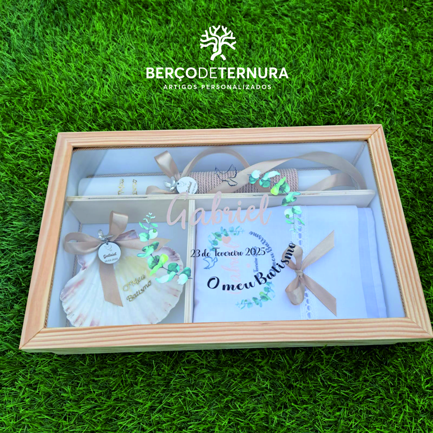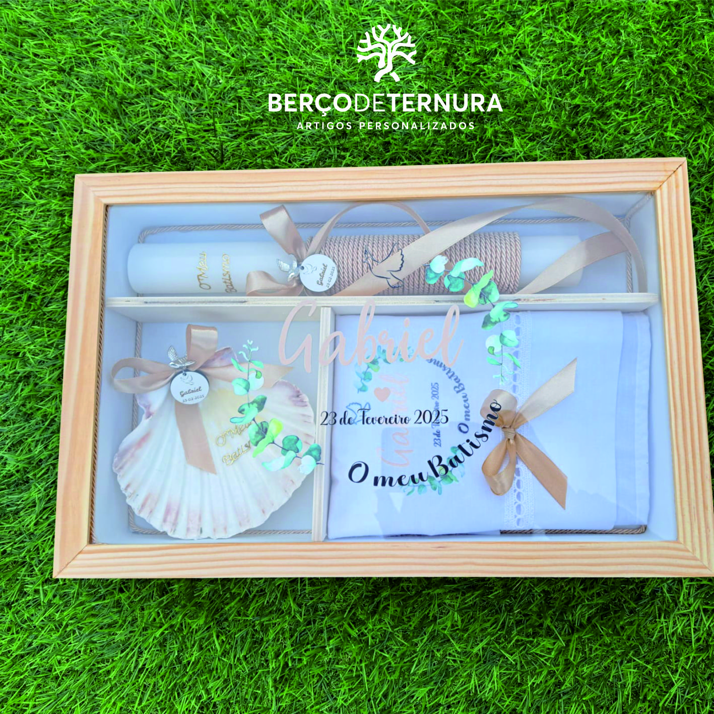 Caixa de Batismo com tampa em vidro, composta por 3 espaços diferenciados, para vela, concha e toalha.