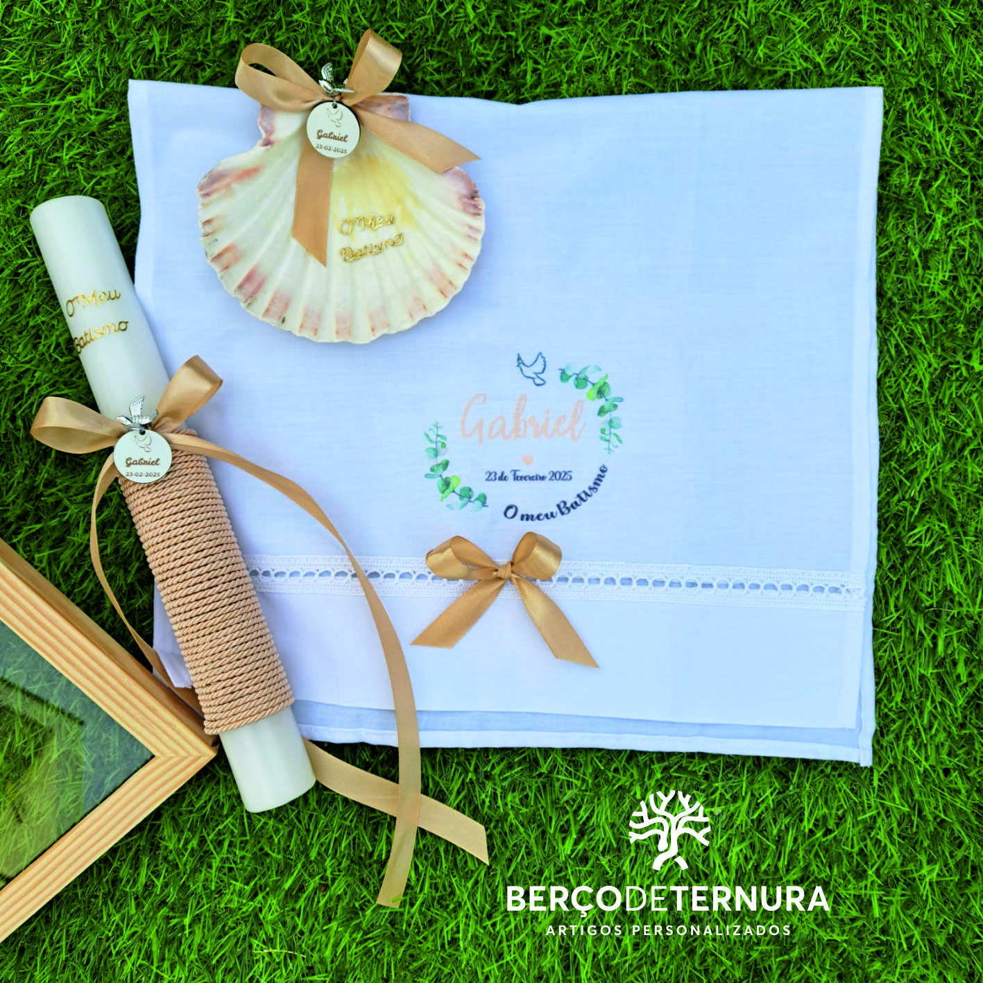A Toalha – para secar a cabeça do bebé após receber a água de batismo de cor branca.