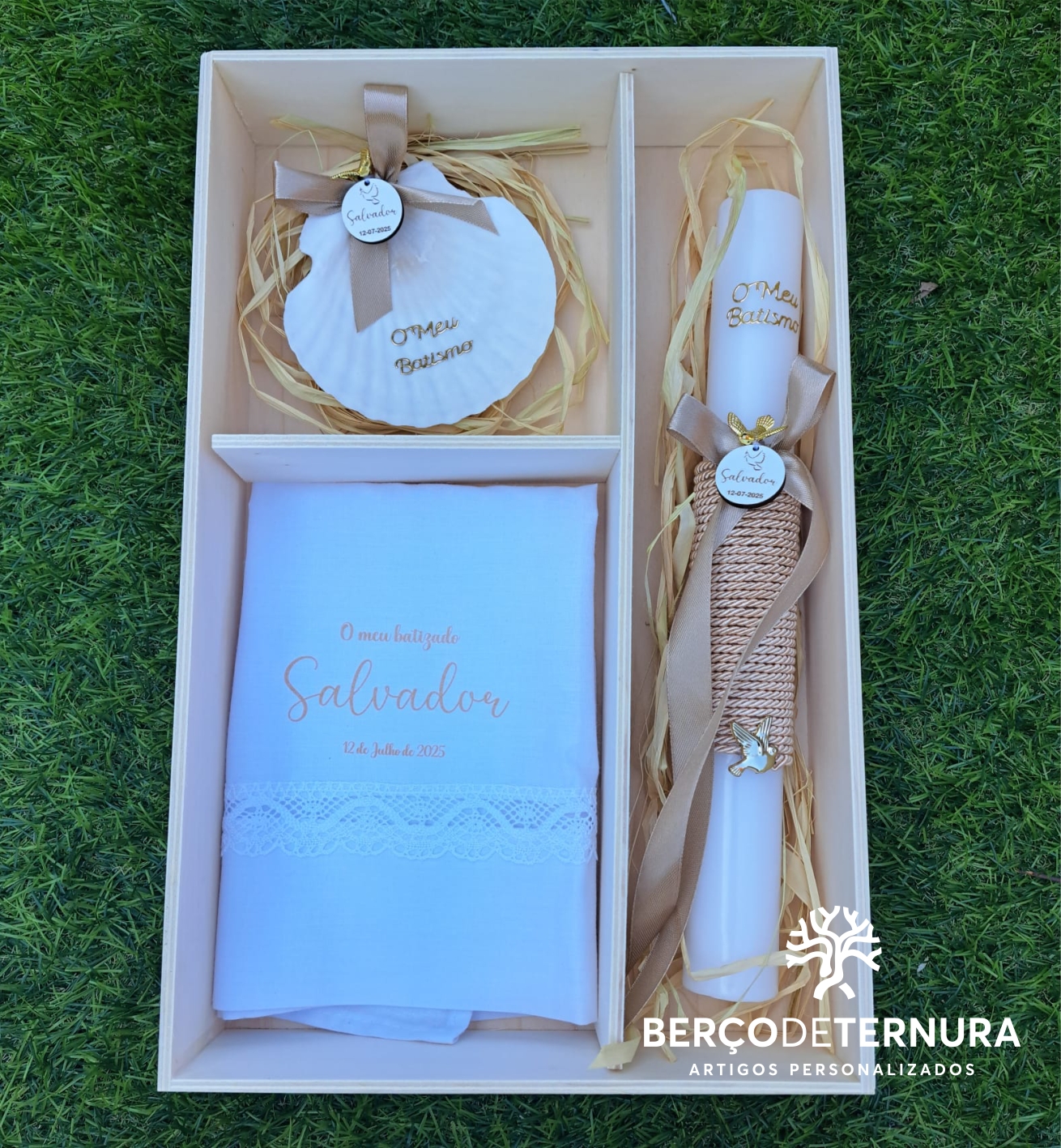 Caixa de Batismo Composta por 3 espaços diferenciados, para vela, concha e toalha. A vela – acesa a partir do círio pascal – representa a luz que protege e ilumina os caminhos de quem está recendo o sacramento. Ela afasta as energias negativas e inspira a elevação espiritual. A Concha – que sacerdote usa para derramar um pouco de água na cabeça do batizando pois a água é, sem dúvida, o principal símbolo do sacramento do batismo. A Toalha – para secar a cabeça do bebé após receber a água de batismo de cor branca. Cor da graça e da manifestação divina, que representa a pureza.