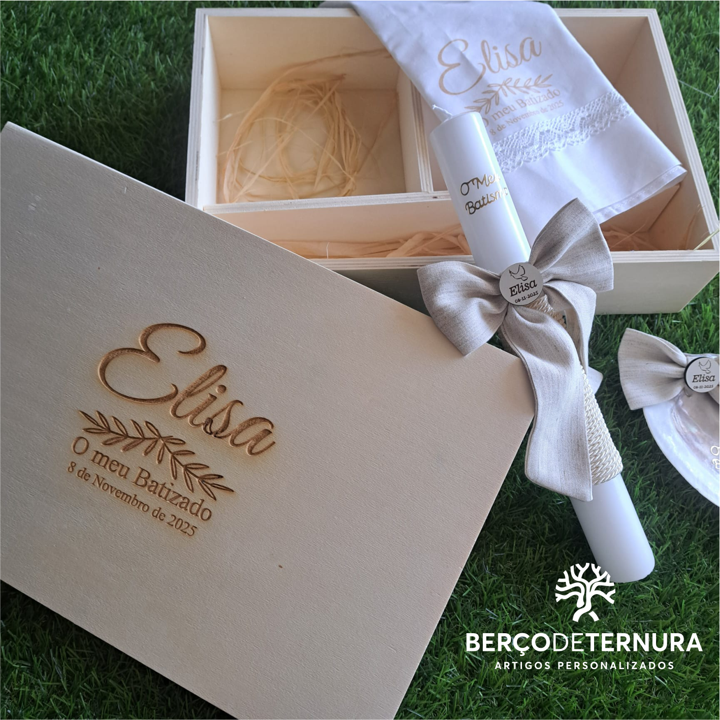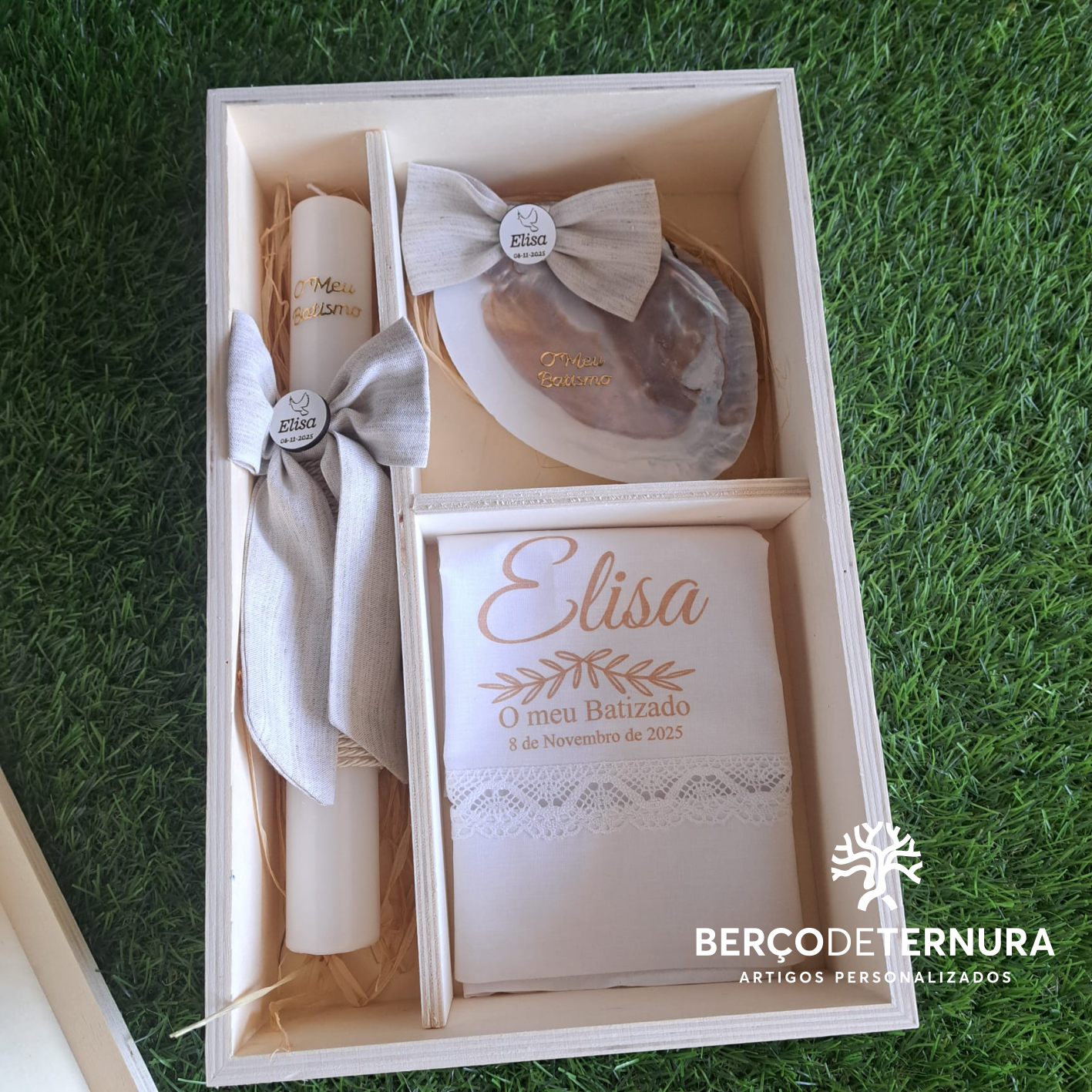 Home Caixa de Batismo Caixa de Batismo Personalizada Laços em linho Caixa de Batismo Personalizada Laços em linho Encomendar / Personalizar Cor do tecido do laço Escolha uma opção Azul Cor de rosa Bege 90,00 € Desconto de %. Comprar Contactar Um conjunto cheio de ternura e significado para celebrar um momento único. Esta caixa é composta por: Concha em madrepérola com medalha em madeiraLaços em linho — um toque elegante e naturalVela e toalha personalizadas com o nome e data do batizado Cada detalhe é preparado com amor, para guardar para sempre a lembrança deste dia tão especial. Personalizamos com o nome, data e elementos que desejar! Partilhar