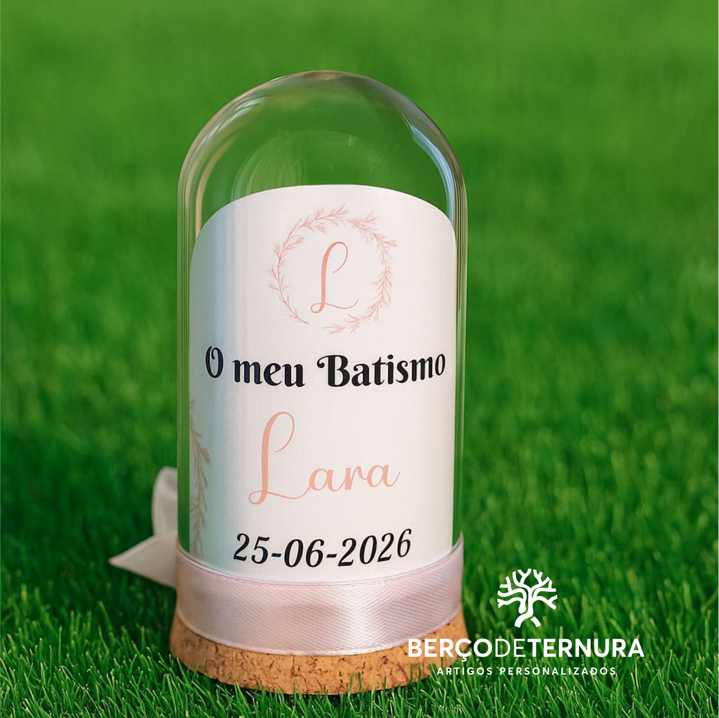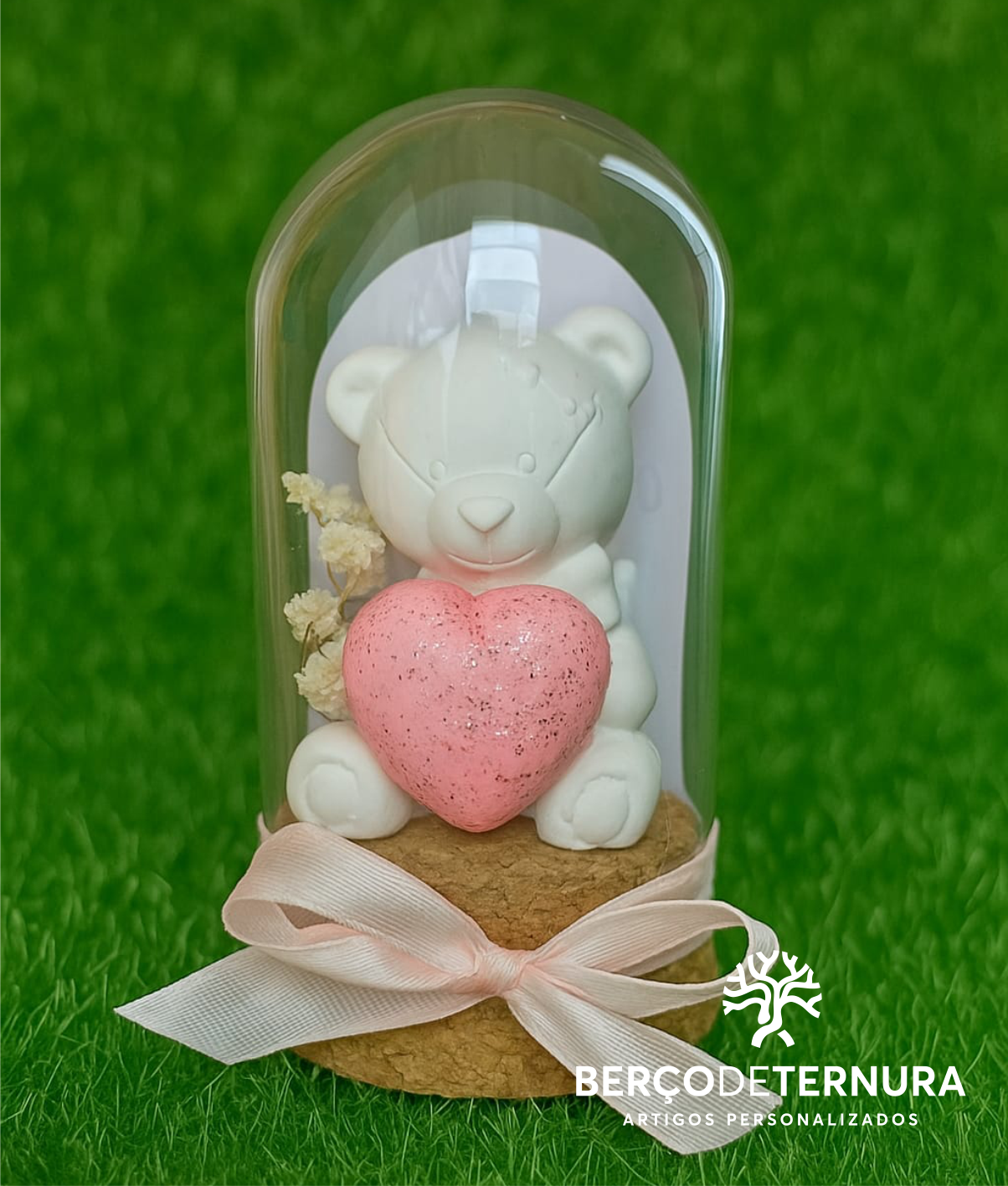 Dentro de uma cúpula transparente, um adorável ursinho branco segura um coração rosa, azul ou dourado com brilhos, simbolizando pureza, amor e carinho. A base em cortiça com laço de cetim acrescenta um toque elegante e sofisticado, tornando esta peça perfeita para marcar este momento tão especial.